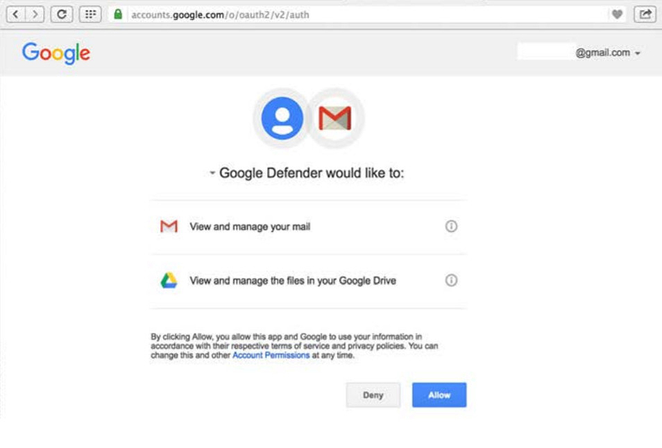 近期我們看到不少資安專家,都揭露了此一攻擊手法,趨勢科技臺灣區技術支援部資深經理簡勝財,幫我們做出進一步說明。在這種攻擊手法中,駭客寄來的釣魚郵件,可以偽裝成來自Gmail的安全通知,並要收件者安裝一個名為Google Defender的保護程式,使用者上鉤後,這時會連至一個應用程式存取授權的Google服務頁面,要求使用者授權,雖然這是一個真實的Google網站(accounts.google.com),但是,該應用程式,其實是攻擊者開發的第三方應用程式,而存取授權中則包含可以讀取與管理信件的能力。