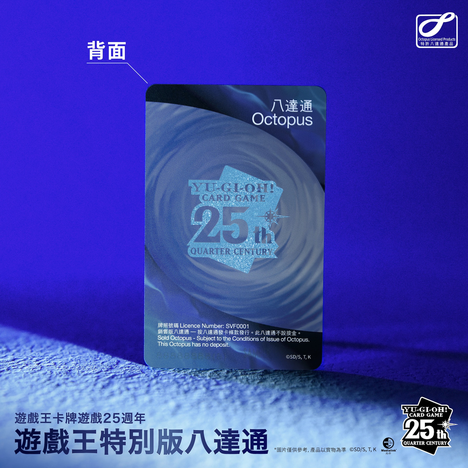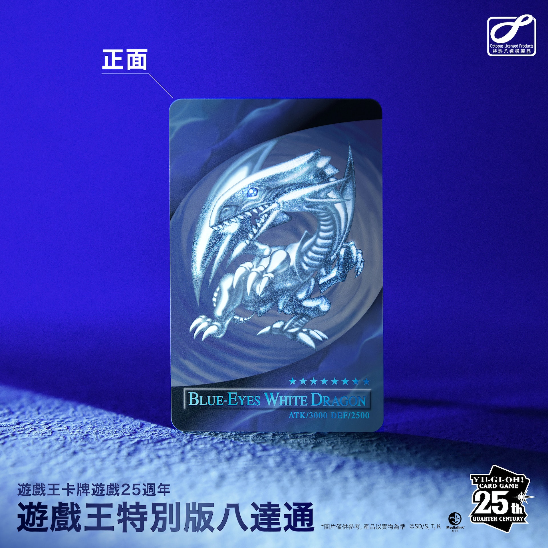 今次的《遊戲王》特別版八達通,卡面圖案為《遊戲王》作品中的經典怪獸「藍眼白龍」,而且更是最為人熟知的版本,原卡屬於遊戲王主要角色之一、海馬瀨人,卡面的龍身有閃粉效果,卡背亦印上《遊戲王》卡牌遊戲25週年圖案,唯一美中不足是此卡並不會像以往幾個作品的八達通一樣在交易時發出閃光特效。